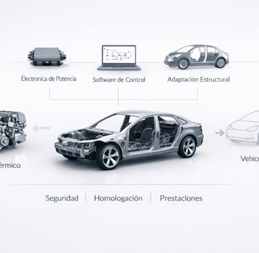 El proyecto se basa en un enfoque ingenieril e industrial, no experimental. Cada conversión se diseña como un sistema completo: sustitución del tren motriz térmico por un sistema eléctrico optimizado, integración de baterías, electrónica de potencia, software de control y adaptación estructural, manteniendo la seguridad, el equilibrio dinámico y las prestaciones del vehículo original o mejorándolas. Todo el proceso se concibe desde el inicio para cumplir los requisitos normativos y de homologación vigentes.